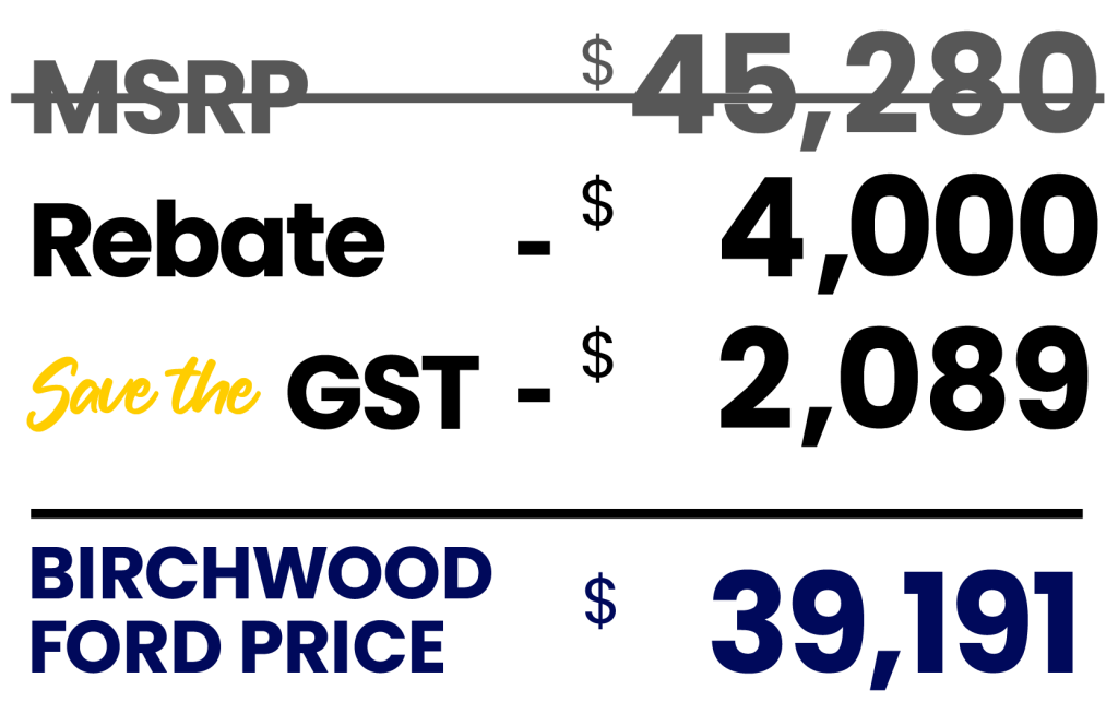 All prices and payments are plus PST and GST. Offer includes the Manitoba EV rebate. Savings in ad available on R26075. Save the GST Event offers 5% savings off vehicle MSRP unless stated otherwise. Lease payment of $98/week + fees +taxes. Available on R26075 at a sale price of *$38,470 + accessories + fees + tax at a 60 month lease at 4.49% APR OAC. Residual value of $6046.32 with a lease allowance of 16,000km/year and excess charged at $0.12/km. Other conditions and exclusions may apply. See Birchwood Ford for details. DLR #4454