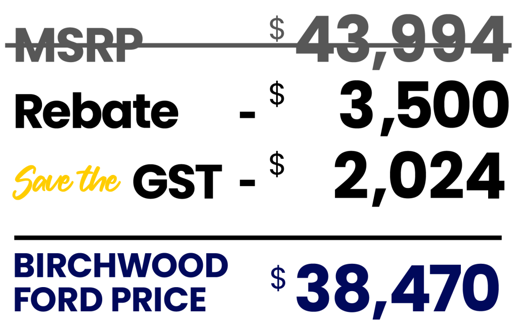 All prices and payments are plus PST and GST. Savings in ad available on R250035. Save the GST Event offers 5% savings off vehicle MSRP unless stated otherwise. Lease payment of $119/week available on R250035 at a sale price of *$39,191 + accessories + fees +  tax at a 60 month lease at 6.29% APR OAC. Residual value of $9,342 with a lease allowance of 16,000km/year and excess charged at $0.12/km. Other conditions and exclusions may apply. See Birchwood Ford for details. DLR #4454