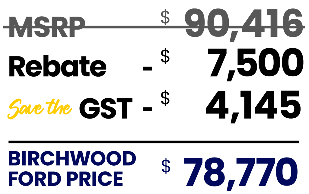 All prices and payments are plus PST and GST. Savings available on stock R25740. MSRP $77,405 Sale Price $64,262. Offer valid until month-end, unless otherwise extended. Factory order may be required. Conditions apply, See Birchwood Ford for details. DLR #4454